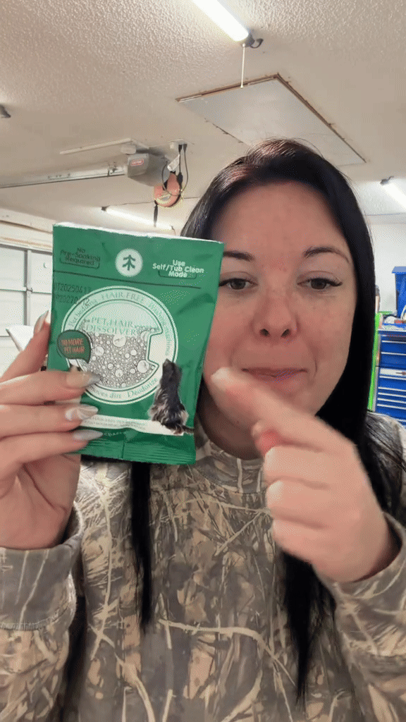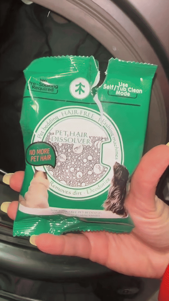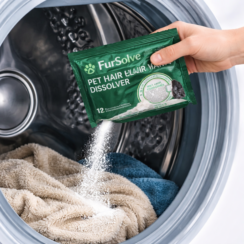 FurSolve helps release pet hair during the wash so it rinses away instead of clinging to fabrics or your washer. Designed for pet bedding, blankets, and heavy hair loads.