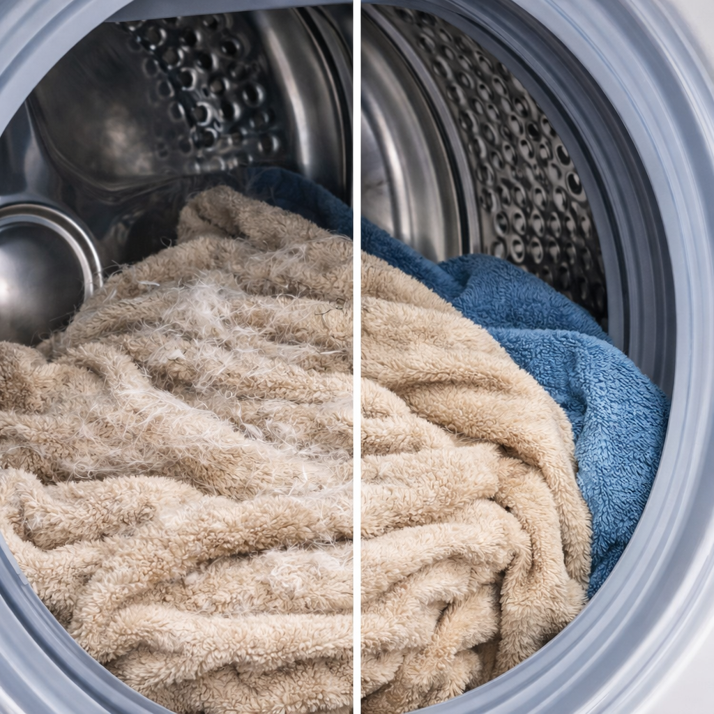 1) Add 1–2 FurSolve sachets to the washing machine drum — with heavily shed items (pet bedding, blankets, throws, towels) or run alone to self-clean the washer.